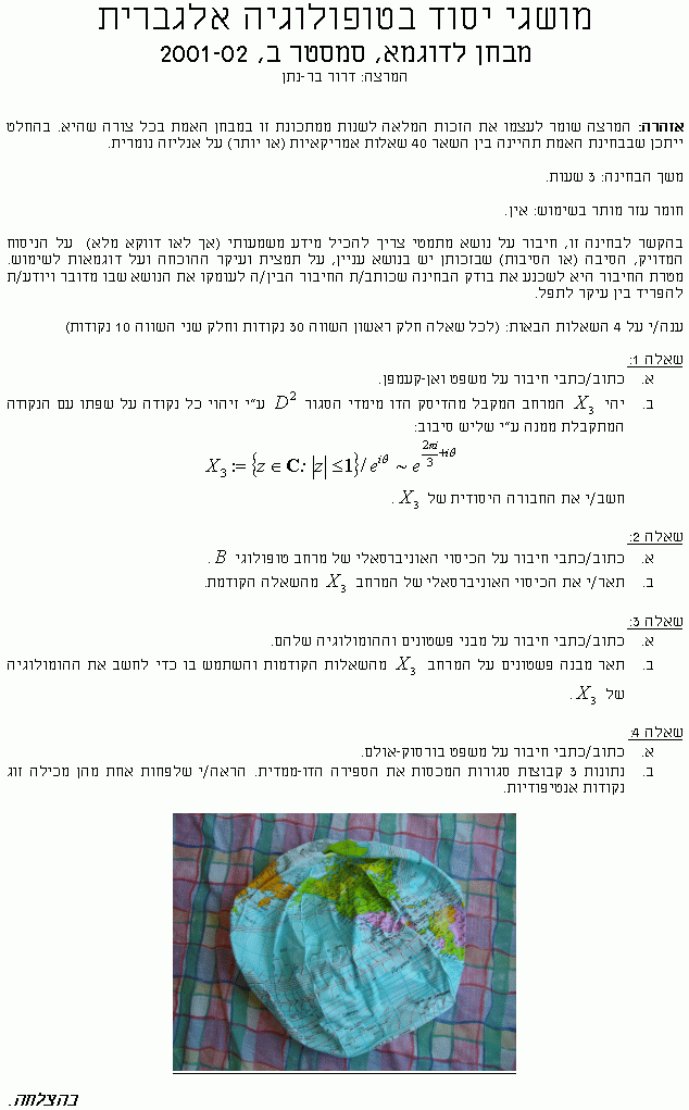 Office hours: July 9 and 10, Math 309, 11:0-13:00. Final examination (Moed A), Rashall Auditorium, July 11th at 10:00-13:00: MoedA.pdf, MoedA.gif (solution to the riddle). |